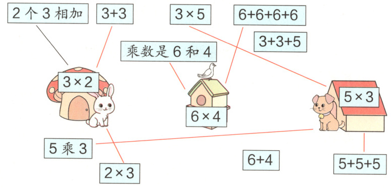 2个3相加—3+3,2个3相加—3×2,2个3相加—2×3;3×5—5乘3,3×5—5+5+5,3×5—5×3;6+6+6+6—乘数是6和4,6+6+6+6—6×4