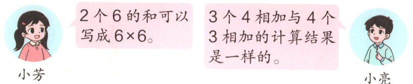 小亮说得对。2个6的和可以写成$6 × 2$。3个4相加写成乘法算式为$4 × 3=12$,4个3相加写成乘法算式为$3 × 4=12$,所以3个4相加与4个3相加的计算结果是一样的。