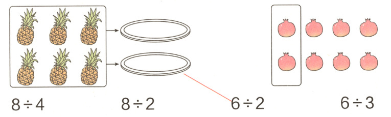 左图(菠萝):6个菠萝,2个圈,对应$6÷2$;右图(石榴):8个石榴,2行(或2组),对应$8÷2$。