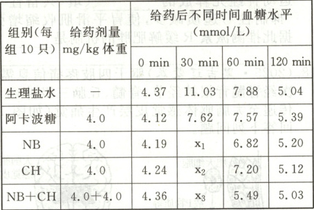 (3)若结论为:NB和CH均能有效降低餐后血糖高峰,且二者共同作用效果更强,则x₁、x₂组血糖应低于生理盐水组,且与阿卡波糖组相似,x₃组血糖应低于x₁和x₂组,故AB项数据符合上述结论,AB正确。