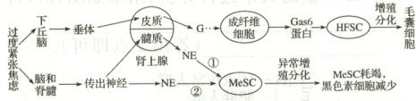 $\\rightarrow$促进①~②:调节过程 MeSC:黑色素细胞干细胞 NE:去甲肾上腺素┅→抑制