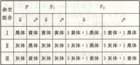 (2)由杂交组合Ⅰ的F₁可知,黑体(A₁)对黄体(A₃)为隐性;由杂交组合Ⅱ可知,灰体(A₂)对黑体(A₁)为显性,所以三者的显隐性关系为灰体对黑体和黄体为显性,黄体对黑体为显性,即A₂>A₃>A₁,由题意可知三个体色基因为复等位基因,根据等位基因概念“位于同源染色体上控制相对性状的基因”可知,体色基因遵循基因分离定律。