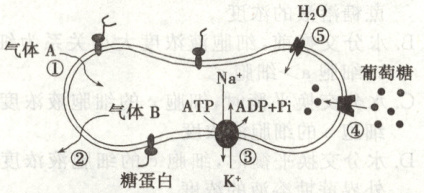 12.(2021·河北)人体成熟红细胞能够运输 $O_2$ 和 $CO_2$,其部分结构和功能如图,①~⑤ 表示相关过程。下列叙述错误的是(