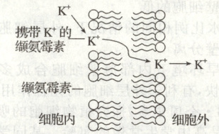 10.(2023·浙江 1 月)缬氨霉素是一种脂溶性抗生素,可结合在微生物的细胞膜上,将 $K^+$ 运输到细胞外(如图所示),降低细胞内外的 $K^+$浓度差,使微生物无法维持细胞内离子的正常浓度而死亡。下列叙述正确的是(