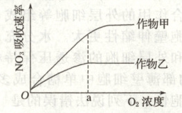 。(2)$O_2$ 浓度大于 $a$ 时作物乙吸收 $NO_3^-$ 速率不再增加,推测其原因是
