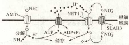 11.(2022·山东卷)$NO_3^-$ 和 $NH_4^+$ 是植物利用的主要无机氮源,$NH_4^+$ 的吸收由根细胞膜两侧的电位差驱动,$NO_3^-$ 的吸收由 $H^+$ 浓度梯度驱动,相关转运机制如图。铵肥施用过多时,细胞内 $NH_4^+$ 的浓度增加和细胞外酸化等因素引起植物生长受到严重抑制的现象称为铵毒。下列说法正确的是(