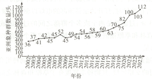 5. [2025·云南卷,11T,3分]在国家和地方政府的大力保护下,中国境内亚洲象数量明显增加。2002—2023年西双版纳野象谷亚洲象种群数量调查结果如图。