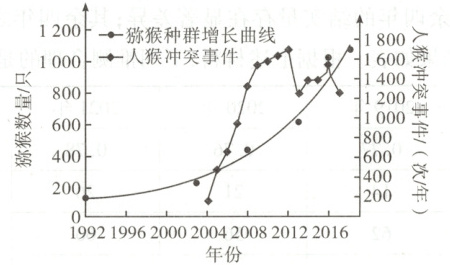 解题思路:公园内空间有限,随着猕猴种群密度增大,猴群数量会受到栖息空间的制约,种群数量不会持续增长,A错误;由题图可知,2013年猕猴数量大约为600只,此时人为投食已存在,且改变了环境条件,实际环境容纳量已被提高(高于840只),故此时人猴冲突事件减少不是因为猕猴种群数量接近自然条件下的环境容纳量,B错误;由题干“1986年后,游客的投喂和以保护为目的的固定投食,致使猕猴种群数量快速增长”可知,人为投食是猕猴种群数量超过自然条件下环境容纳量的主要原因,C正确;适时迁出部分猕猴可降低种群密度,从而缓解人猴冲突,是保护猕猴、达到人与动物和谐共处的合理措施,D正确。