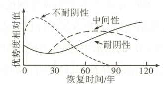 17. 某林地去除所有植被后,耐阴性不同的树种类群在植被恢复过程中优势度的变化如图所示。下列叙述正确的是(