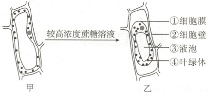 解题思路 由题干可知,该细胞可用于“观察叶绿体和细胞质流动”和“质壁分离”实验,说明实验过程中叶肉细胞没有失活,A错误;①与②的分离,与①细胞膜的选择透过性有关,这是因为水分子可以通过细胞膜,而蔗糖不能通过细胞膜,B错误;与图甲相比,图乙细胞处于失水状态,细胞液渗透压升高,吸水能力更强,C正确;与图甲相比,图乙细胞体积几乎不变,这是因为植物细胞的细胞膜外面有一层细胞壁,其作用主要是保护和支持细胞,伸缩性比较小,D错误。