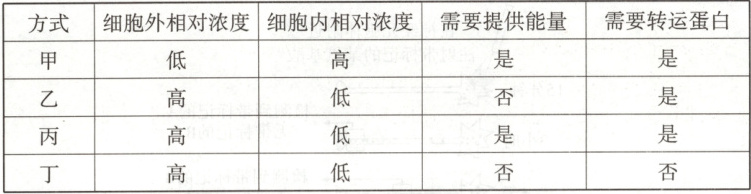 解题思路 题干描述为“小肠上皮细胞吸收营养物质方式的判断”,故营养物质由细胞外进入细胞内。甲为营养物质从低浓度向高浓度运输,且需要能量和转运蛋白,为主动运输,A正确;乙为营养物质从高浓度向低浓度运输,不需要能量但需要转运蛋白,为协助扩散,B正确;营养物质可通过胞吞作用从高浓度向低浓度运输,该过程需要能量但不需要转运蛋白,C错误;丁为营养物质从高浓度向低浓度运输,不需要能量和转运蛋白,为自由扩散,D正确。