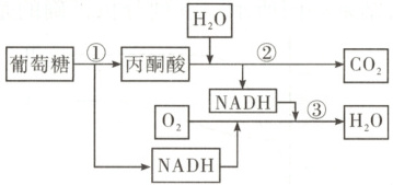 解题思路 ①为细胞呼吸的第一阶段,葡萄糖分解为丙酮酸(糖酵解过程),发生在细胞质基质,②为有氧呼吸第二阶段,发生在线粒体基质;③为有氧呼吸第三阶段,发生在线粒体内膜。A 正确。有氧呼吸第三阶段(③)中,NADH 通过电子传递链将电子传递给氧气,最终与 ${H^{+}}$ 结合生成水,即 NADH 通过一系列化学反应参与了水的形成,B 正确。无氧条件下,①糖酵解过程能够进行,该阶段产生的丙酮酸在酶(与催化有氧呼吸的酶不同)的催化作用下,分解成酒精和二氧化碳,或者转化成乳酸,场所是细胞质基质,即无氧条件下,②③不能进行,①能正常进行,C 错误。无氧呼吸仅第一阶段(①)产生少量 ATP 和 NADH,第二阶段不产生 ATP,①产生的 NADH 用于还原丙酮酸,D 错误。