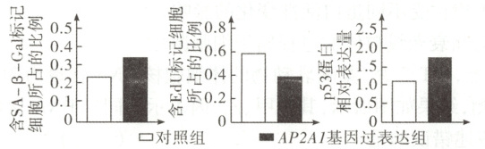 解题思路 从左图看出,对照组中SA - β - Gal含量不为0,而SA - β - Gal是细胞衰老的分子标志,所以对照组中也有衰老的细胞,A正确;从最右图看出,AP2A1基因过表达组中p53蛋白含量明显比对照组多,所以蛋白AP2A1促进了细胞中p53蛋白积累,B正确;据图可知,衰老细胞中与衰老有关的蛋白质表达量增加,但不是各种蛋白质(如与DNA复制有关的蛋白质)的表达量都会增加,C错误;EDU是细胞DNA复制的标记,而细胞增殖过程中会发生DNA复制,所以含EdU标记的细胞所占比例越大,表明细胞增殖越旺盛,D正确。