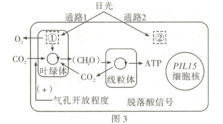 (3)通路1为植物的光合作用过程,①光反应阶段发生在类囊体薄膜上,吸收的光能被转化为储存在ATP和NADPH中的化学能;暗反应阶段发生在叶绿体基质中,ATP和NADPH中的化学能被转化为储存在糖类等有机物中的化学能。通路2中吸收光的物质②为光敏色素,光敏色素是一类蛋白质(色素—蛋白复合体),分布在植物的各个部位,其中在分生组织的细胞内比较丰富。在受到光照射时,光敏色素的结构会发生变化,这一变化的信息会经过信息传递系统传导到细胞核内,影响特定基因的表达,从而表现出生物学效应。故光敏色素吸收光能后,促进细胞核内PIL15基因的表达,进而激活脱落酸信号通路,使脱落酸发挥抑制气孔开放的作用,具体见答案图。