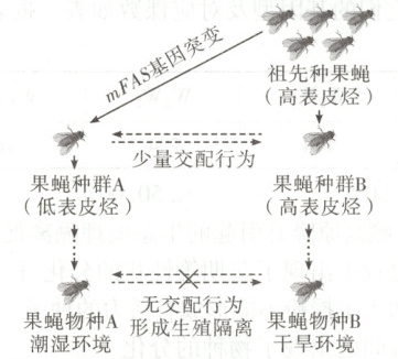 解题思路 突变和基因重组提供进化的原材料,自然选择导致种群基因频率的定向改变,进而通过隔离形成新的物种,即突变和自然选择驱动了果蝇物种 A 和物种 B 的形成,A 正确;在生存斗争中,某些可遗传的有利变异将赋予个体在特定环境中生存和繁殖的优势,通过自然选择,这些可遗传的有利变异逐渐积累,使生物更好地适应特定的环境,由图可知,具有低表皮烃性状的果蝇种群 A 在潮湿环境中形成果蝇物种 A,说明自然选择使具有低表皮烃性状的果蝇适应潮湿环境,B 正确;种群 A 和种群 B 交配减少,基因交流减少,会使两个种群基因库差异越来越大,加快生殖隔离的形成,进而加速新物种的形成,C 正确;mFAS 基因突变的双重效应是使果蝇的环境适应能力改变和影响交配对象的选择,而突变和基因重组提供进化的原材料,自然选择导致种群基因频率的定向改变,进而通过隔离形成新的物种,即基因突变不足以导致生殖隔离,D 错误。