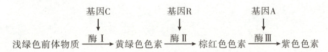 (1)据色素合成代谢途径图可知,颖壳表型为紫色、棕红色、黄绿色和浅绿色对应的基因型分别是C_R_A_、C_R_aa、C_rr____、cc________,三对基因独立遗传。基因型为CcRrAa与CcRrAa的个体杂交,单独考虑C/c,子代基因型及比例为C_:cc=3:1;单独考虑R/r,子代基因型及比例为R_:rr=3:1;单独考虑A/a,子代基因型及比例为Aa:aa=1:1。由于三对基因遵循自由组合定律,故F1中颖壳表型为紫色、棕红色、黄绿色和浅绿色的比例为9:9:6:8。对于浅绿色个体而言,其基因型为cc________,由于缺少酶I,其后代表型均保持不变,占比8/32;对于黄绿色个体而言,基因型为CCrr____的个体,由于缺少酶II,后代表型保持不变,占比2/32;对于棕红色个体而言,基因型为CCRRaa的个体,由于缺少酶III,后代表型保持不变,占比1/32;对于紫色个体(C_R_Aa)而言,后代均会发生性状分离,即F1中,颖壳颜色在后代持续保持不变的个体所占比例为11/32。