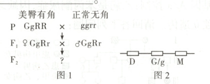 (2)由于美臀性状在G基因来源于父本时才表现,所以P中美臀有角羊应作为父本,正常无角羊作为母本,当两者杂交后,可根据表型判断其基因型,即表型为美臀有角的雌雄个体基因型为GgRr,以便进行个体的选择与杂交,但若反之,则后代表型均为正常有角,群体中的基因型为GgRr和ggrr,不利于进行个体基因型的确定和选择培育。据图1可知,$F_1$中基因型为GgRr的雌雄个体杂交,若要使$F_3$中美臀无角个体(Ggrr,G基因来自父本)比例最高,应选择$F_2$中基因型为GGrr的公羊和基因型为ggrr的母羊。