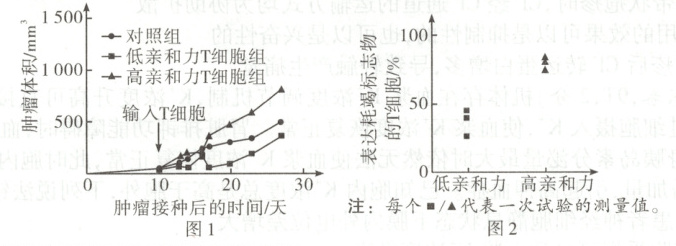 解题思路 免疫自稳是指机体清除衰老或损伤的细胞,进行自身调节,维持内环境稳态的功能,而机体识别和清除突变的细胞,防止肿瘤发生体现了免疫监视功能,A错误;肿瘤发生过程中可产生肿瘤特异性抗原,T细胞表面的受体不能直接识别该抗原,需由抗原呈递细胞摄取和加工处理并将抗原信息暴露在细胞表面,以便呈递给其他免疫细胞,B错误;由图1可知,与对照组相比,低亲和力T细胞组的肿瘤体积变小,而高亲和力T细胞组的肿瘤体积变大,说明低亲和力T细胞能够抑制肿瘤生长,C正确;由图2可知,高亲和力组表达耗竭标志物的T细胞占比高于低亲和力组,而表达耗竭标志物的T细胞比例与其耗竭程度呈正相关,说明高亲和力组的T细胞功能下降和增殖能力减弱,即高亲和力T细胞更易耗竭且能抑制小鼠的免疫,D正确。