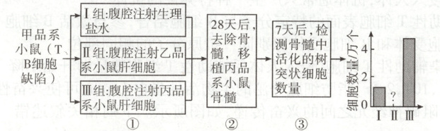 解题思路 由题图可知,树突状细胞的免疫记忆体现在活化的树突状细胞数量增多,A错误;②操作移植的丙品系小鼠骨髓对于甲品系小鼠来说是抗原,③中活化的树突状细胞可识别丙品系小鼠的抗原,B正确;由于①中Ⅰ、Ⅱ两组未注射丙品系小鼠的肝细胞,Ⅲ组注射丙品系小鼠肝细胞,再经过②,故Ⅲ组小鼠体内会有可以识别丙品系小鼠抗原的记忆树突状细胞,而Ⅰ、Ⅱ组小鼠体内不存在能识别丙品系小鼠抗原的记忆树突状细胞,故Ⅱ组中检测到的活化树突状细胞数量与Ⅰ组相近,C正确;Ⅱ组和Ⅲ组小鼠分别注射了乙、丙品系的小鼠肝细胞,故骨髓中可分别检测到可以识别乙、丙品系小鼠抗原的记忆树突状细胞,D正确。