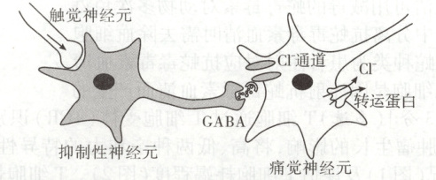 22. [2024·广东卷,16T,4 分]轻微触碰时,兴奋经触觉神经元传向脊髓抑制性神经元,使其释放神经递质 GABA。正常情况下,GABA 作用于痛觉神经元引起 Cl⁻通道开放,Cl⁻内流,不产生痛觉;患带状疱疹后,痛觉神经元上 Cl⁻转运蛋白(单向转运 Cl⁻)表达量改变,引起 Cl⁻的转运量改变,细胞内 Cl⁻浓度升高,此时轻触引起 GABA 作用于痛觉神经元后,Cl⁻经 Cl⁻通道外流,产生强烈痛觉。针对该过程(如图)的分析,错误的是 (