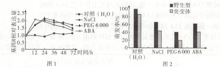 15. [2024·湖南卷,11T,2分]脱落酸(ABA)是植物响应逆境胁迫的信号分子,NaCl和PEG6000(PEG6000不能进入细胞)皆可引起渗透胁迫。图1为某水稻种子在不同处理下基因R的相对表达量变化,图2为该基因的突变体和野生型种子在不同处理下7天时的萌发率。研究还发现无论在正常还是逆境下,基因R的突变体种子中ABA含量皆高于野生型。下列叙述错误的是(