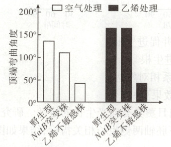 解题思路 从图中可以看出,对于野生型而言,乙烯处理组的拟南芥幼苗顶端弯曲角度比空气处理组大,所以乙烯会促进拟南芥幼苗顶端弯曲角度的增大,A正确;由A选项可知,乙烯会促进拟南芥幼苗顶端弯曲角度的增大,空气处理组野生型拟南芥顶端弯曲角度比NatB突变株大,可以推测野生型拟南芥内源性乙烯含量高于NatB突变株,由此可知,NatB基因突变会导致拟南芥内源性乙烯水平下降,B正确;空气处理组的NatB突变株顶端弯曲角度低于野生型、但高于乙烯不敏感株之间,推知NatB突变株中仍存在具有活性的氧化酶ACO,且NatB能够抑制ACO的降解,进而催化ACC生成乙烯,因此给NatB突变株外源施加ACC能增加乙烯合成,增大NatB突变株顶端弯曲角度,C正确;乙烯无法对乙烯不敏感株起作用,但乙烯不敏感株中NatB未发生突变,仍能促进ACO的乙酰化,抑制ACO降解,进而促进ACC转化为乙烯,D错误。