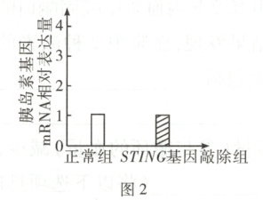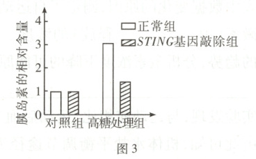 ②图2显示正常组和STING基因敲除组的胰岛素基因mRNA相对表达量基本无差异,表明STING基因缺失后胰岛素的转录未受影响;图3显示未高糖处理时,两组的胰岛素相对含量基本相同,高糖处理时STING基因敲除组的胰岛素的相对含量明显低于正常组,由题干可知,有些2型糖尿病患者的胰岛B细胞中STING信号异常,综上可知,胰岛B细胞中STING缺失不影响胰岛B细胞中胰岛素基因的转录,但会影响高糖信号的传导,使胰岛B细胞对高血糖不敏感,进而使胰岛素的分泌异常。