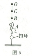 9. 反向蹦极是一项比蹦极更刺激的运动。如图5所示,弹性轻绳的上端固定在$O$点,拉长后将下端固定在体验者的身上,并与固定在地面上的扣环相连。打开扣环,将人从$A$点由静止释放,人像火箭一样被竖直发射,经$B$点上升到最高位置$C$点,在$B$点时速度最大。对此过程下列描述正确的是(