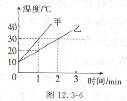 5. 用相同的加热器同时对质量相等的甲、乙两种液体加热(不计热量损失),根据记录的实验数据描绘二者的温度—时间图像,如图 12.3-6 所示。已知乙液体为煤油,$c_{煤油}=2.1×10^{3}J/(kg·℃)$,根据图像可计算出甲物质的比热容为