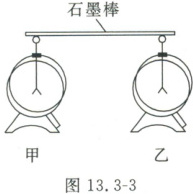 5. 如图 13.2-3 所示,在干燥环境中,取两个相同且不带电的验电器甲和乙,让用毛皮摩擦过的橡胶棒接触甲的金属球,甲的金属箔片张开;再用石墨棒连接甲、乙验电器的金属球,观察到乙的金属箔片张开。用石墨棒连接两金属球的瞬间,电流方向为由