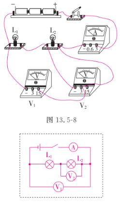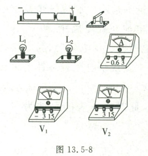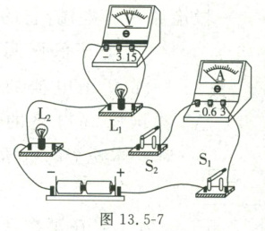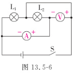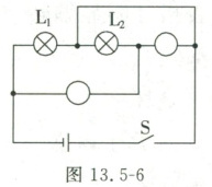 9.在图13.5-6所示电路的“$○$”内填上适当的电表符号,并用“$+$”“$-$”在电表旁边标出正、负接线柱的位置。要求:当开关S闭合时,两灯泡均发光。