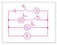 灯$L_1$、$L_2$串联,用电压表$V_1$测电路的总电压,用电压表$V_2$测$L_2$两端的电压,用电流表测电路中的总电流。在虚线框内根据实物图画出对应的电路图。