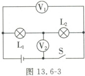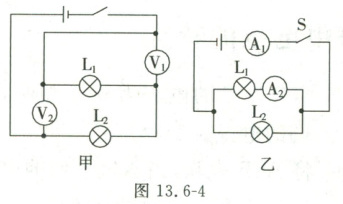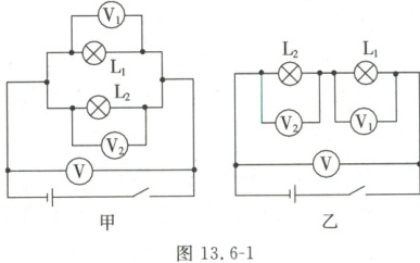 $V$。在图13.6-1乙所示的电路中,闭合开关后电压表$V_1$的示数为$2.5 V$,$V_2$的示数为$3.8 V$,$V$的示数应为6.3