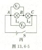 (3)具有创新精神的小雅决定改进实验。她按照图13.6-5丙所示电路图连接好电路,闭合开关,发现电压表$V_1$和$V_2$的指针偏转角度相同,则电压表(选填“$V_1$”或“$V_2$”)选的是大量程,此时电压表$V_1$和$V_2$的示数分别为$V$和$V$。