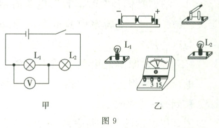 9. 请根据图 9 甲所示的电路,用笔画线代替导线,将图 9 乙中的实物连接起来(两灯泡规格相同)。