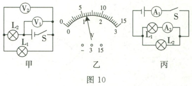 10. 如图 10 甲所示,$V_1$ 和 $V_2$ 是两只相同的电压表。闭合开关后,灯泡 $L_1$、$L_2$ 都发光,这时两只电压表的指针偏转角度相同,如图 10 乙所示。