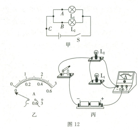 12. 小明和小雨在“探究并联电路中电流的特点”实验中,按图 12 甲所示的电路进行了实验。