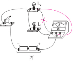 (1) 小雨同学在闭合开关前,发现电流表表盘如图 12 乙所示,可能的原因是。如图 12 丙所示,电流表测的是图 12 甲中通过(选填“$A$”“$B$”或“$C$”)点的电流。接下来小雨想继续测量通过灯泡 $L_1$ 的电流,请你在图 12 丙中把电路改接好(在改动的导线上打“×”)。