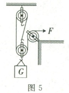 6. 建筑工地的工人用图 5 所示的滑轮组来提升重物。已知重物$G=900\ N$,不计绳重和摩擦,当绳子自由端的拉力$F=400\ N$时,将重物匀速提升 2 m。在此过程中,拉力 F 做功