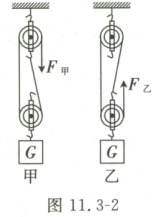 5. 如图11.3-2所示,某物理兴趣小组分别用甲、乙两个滑轮组做测量滑轮组机械效率的实验。他们分别用这两个滑轮组匀速提起质量相同的物体,把物体提升相同的高度,不计绳重及摩擦,每个滑轮的质量相同。对比两个滑轮组,下列说法正确的是(
