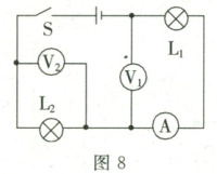 13. 如图8所示,已知电源电压为 $12 V$,闭合开关S,电压表 $V_2$ 的示数为 $7.5 V$,通过灯泡 $L_2$ 的电流为 $0.5 A$,不考虑温度对灯丝电阻的影响。