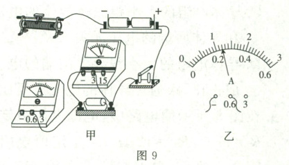 (2)闭合开关后,小亮进行了5次实验,得出了下表的数据,其中第4次实验时,电流表指针如图9乙所示,其示数为 $A$。由表中数据可知,实验中所用电阻的阻值为 $\Omega$。