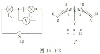 6.在图15.1-3甲所示电路中,电源电压恒为$4V$,使用适当的电表量程后,闭合开关$S$,电压表的示数如图15.1-3乙所示,则电压表的示数为