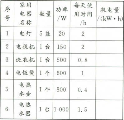 |序号|家用电器名称|数量|功率/W|每天使用时间/h|耗电量/(kW·h)|