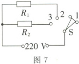 10. 图7所示的是一种电热水龙头的电路简图。旋转开关$S$同时接触两个相邻触点,从而控制流出的水为冷