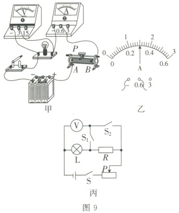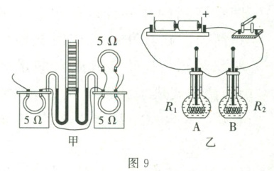 (2)如图9甲所示,两密闭容器中的电阻一样大,在其中的一个外部并联一个阻值大小相同的电阻,则通过两瓶中电阻丝的电流