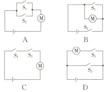 D.$S_1$与电动机串联,$S_2$与该支路并联(控制干路?原描述可能有误,按选项描述逻辑调整) (需图示,用文字描述电路连接情况)