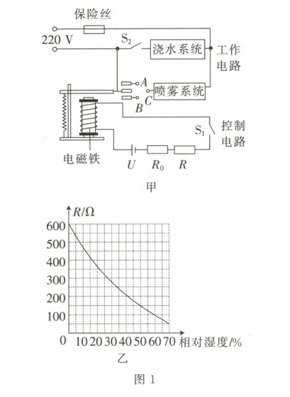 1. 某生态园在花棚里安装了自动喷雾和浇水系统,其简化后的电路如图1甲所示。浇水系统的开关$S_2$是电子时控开关,每天上午$7:00—7:15$、中午$12:00—12:15$、下午$17:00—17:15$会自动闭合,启动浇水系统对花卉进行浇淋。喷雾系统用于调节空气湿度,其控制电路中电源电压$U = 12 V$,$R$为装在探头上的湿敏电阻,其阻值随相对湿度变化的图像如图1乙所示。当控制电路的电流达到$0.04 A$时,继电器的衔铁被吸合;当控制电路中的电流减小到$0.03 A$时,衔铁被释放。
