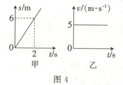 7. 物体在同一水平面上做匀速直线运动。当物体运动路程与时间的关系如图4甲所示时,物体受到的水平推力为$F_1$;当物体运动的速度与时间的关系如图4乙所示时,物体受到的水平推力为$F_2$。两次推力的功率分别为$P_1$、$P_2$,则$F_1:F_2$和$P_1:P_2$分别为(