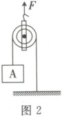 4. 如图2所示,一滑轮下端悬吊一个重$100 N$的物体A,滑轮重$2$$ N$,在拉力$F$的作用下物体A在$2 s$内上升了$4 m$,绳的重力和摩擦不计。滑轮上升的速度$v=\underline{\hspace{2cm}}$m/s,拉力$F$所做的功$W=\underline{\hspace{2cm}}$J。